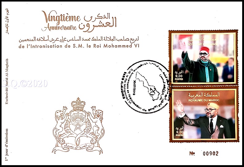 The Moroccan Post issued a commemorative sheet marking the twentieth anniversary of King Mohammed VI’s seat on the throne of the Kingdom of Morocco.